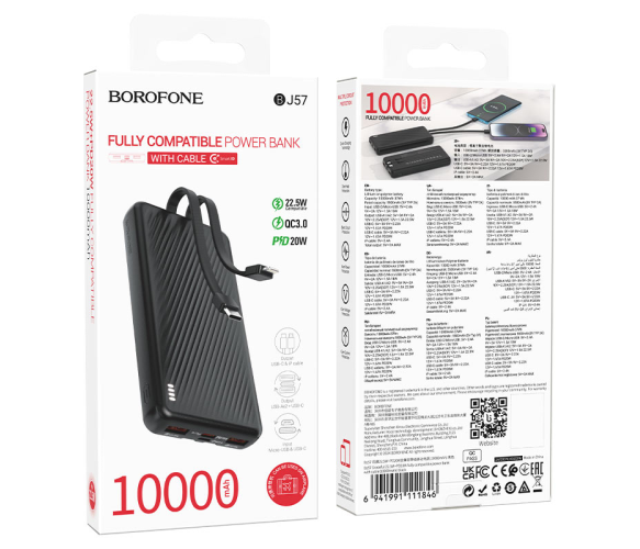 Power bank Borofone BJ57 10000mAh, 22.5W, кабеля USB: Lighting, Type-C, Black, 270g, Box