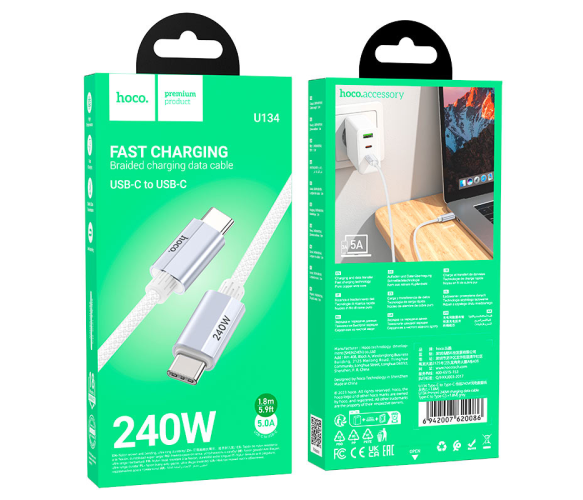 Кабель Hoco U134, Type-C-Type-C, 240W, довжина 1.8м, Gray, BOX