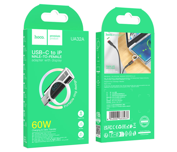 Перехідник HOCO UA32A Type-C(M) => Lighting(F), 60W, індикатор потужності заряду), Silver, Box