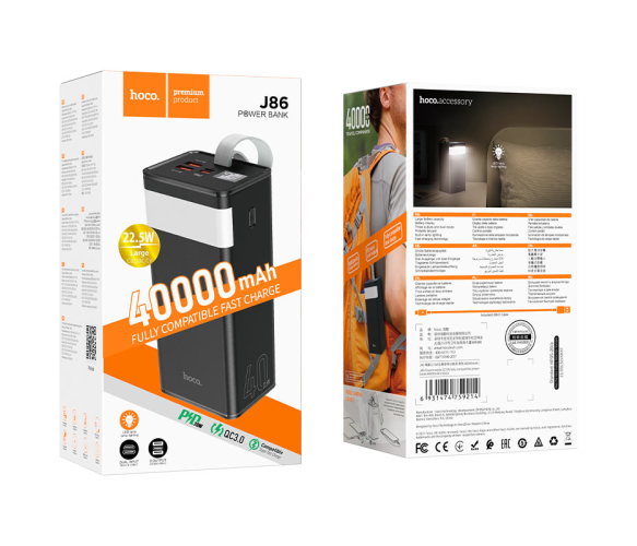 Power Bank HOCO J86 40000mAh, 2USB+Type-C+micro, PD20W, ліхтарик, Black, 0.790kg