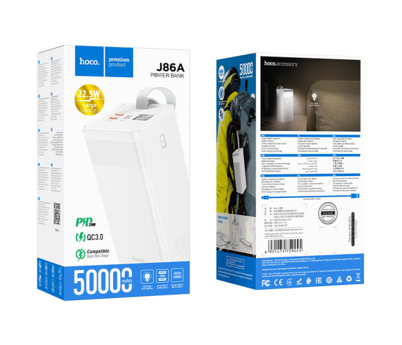 Power Bank HOCO J86A 50000mAh, 2USB+Type-C, 22.5W+PD20W, ліхтарик, White, 0.975kg