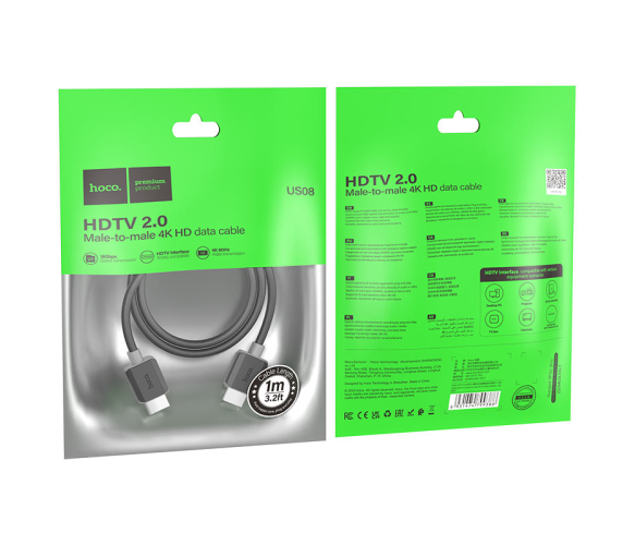 Кабель HOCO HDMI-HDMI 4Kx2K Ultra HD, 1m, v2,0, круглий Black, конектор Black, Blister