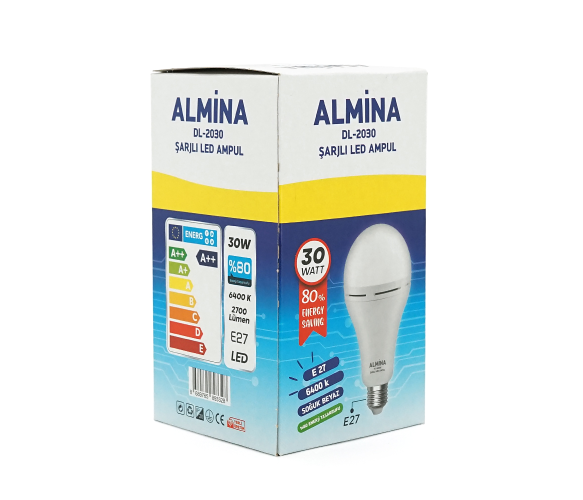 Лампочка з акумуляторами ALMINA DL-2030, 220-240V, до 2 годин роботи, 4 години зарядки, 30W(300W), E27, 2700Лм, 6400K, Box