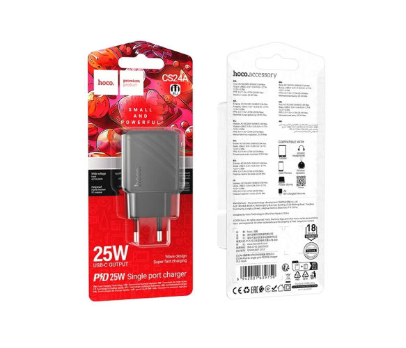 СЗУ 110-240V HOCO CS24A USB-C+USB, 25W, Black, Box