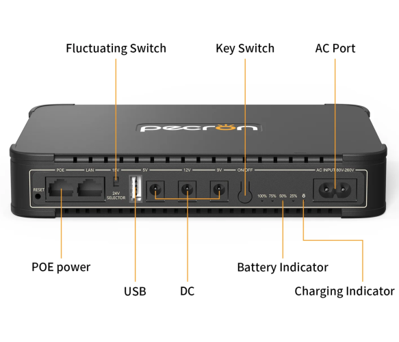 ИБП для роутера Pecron D39, 36W 38.48Wh, Output: USB 5V 2.6A Max, 9V 2A Max/12V 2A Max /5V2.6AMax/15V or 24V POE, 199.6*144.6*34.6mm, 500g, Black, BOX