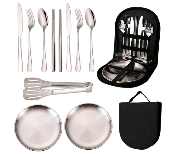 Набір посуду з 11 предметів для пікніка (ложки, виделки, ножі, тарілки, палички) 24x24cm, 0,140 кг, Bag, Silver