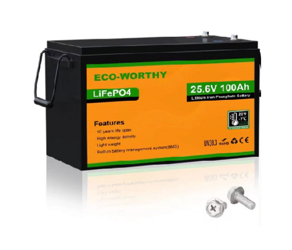 Аккумуляторная батарея Eco-Worthy LiFePO4 25,6V 100Ah,(80/100A), -7°C до 60°C, винт M8, 340*188*245 мм. 18 кг