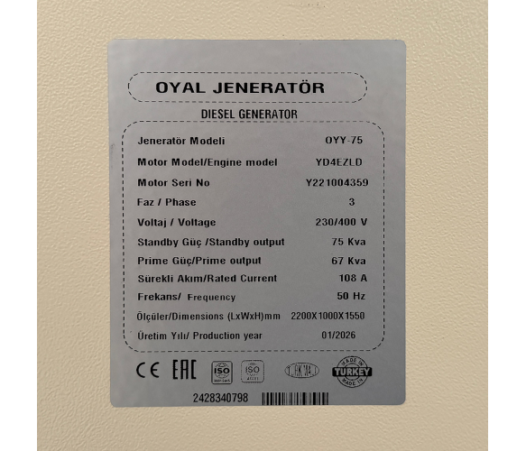 Дизельний генератор OYAL OYY-75 YANG DONG Y4EZLD 75KVA/60KW, Альтернатор OYL224G, AVRSX460, витрата 75% навантаження - 10,5 літрів/год, 230/400 В, 50 Гц (AVR+ATS) 2400*1000*1500 мм, 1100 кг, 170 л