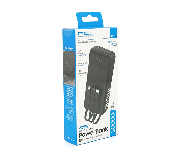 Powerbank ACL PW-117 20000mAh, PD22.5W, 1xUSB+2xUSB-C, 3 кабелі (USBType-C/Lighting), 0.47кг, Black/White, Box