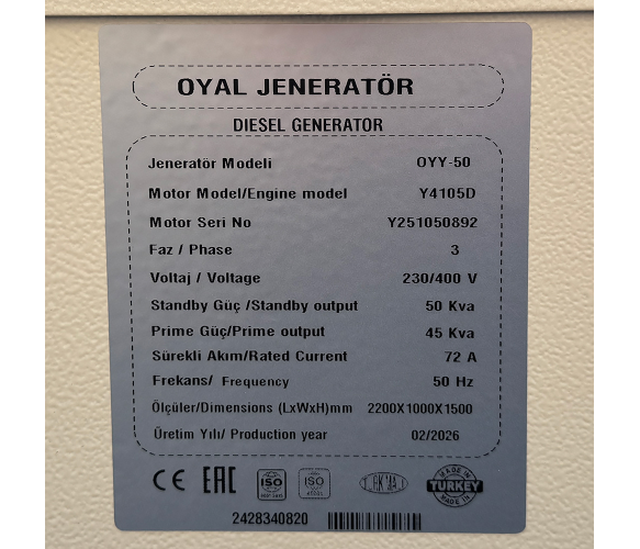 Дизельний генератор OYAL OYY-50 YANG DONG Y4105D 50KVA/40KW, Альтернатор OYL224D, AVRXS460, витрата 75% навантаження - 8,2 літрів/годину, 230/400V, 50Hz (AVR+ATS) 2300*950*1400mm, 950kg, 140L