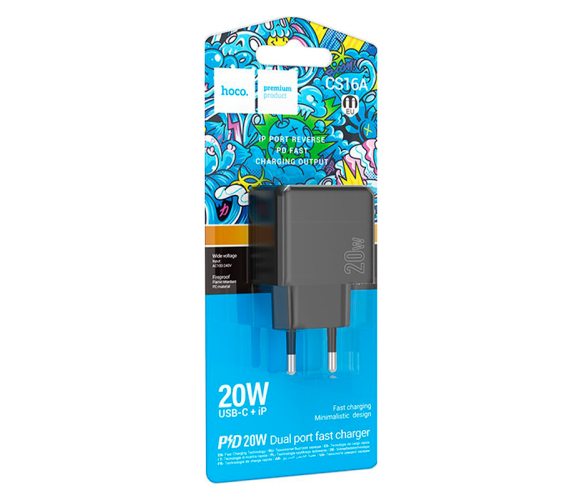 Набір СЗУ HOCO CS16A+ кабель Туре-С/Lighting, 1xUSB-C+1xLighting, PD20W, Black, Box