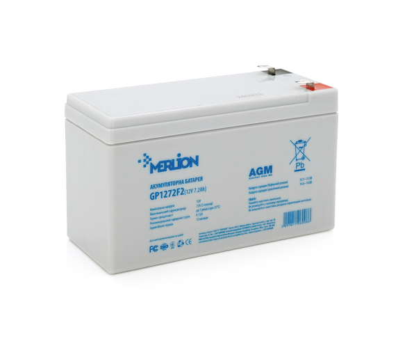 Акумуляторна батарея MERLION AGM GP1272F2 – правильна батарея для пристроїв з невеликим споживанням енергії. Міцний корпус, довгий термін служби, широкий спектр застосування - це акб MERLION!