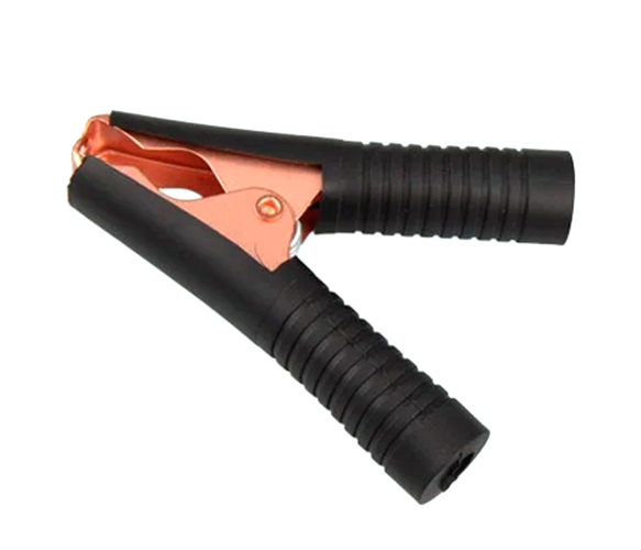 Акумуляторний затиск "крокодил" чорного кольору з щільним гумовим кожухом, призначений для використання в електричних електричних ланцюгах з номінальним струмом до 200А і довжиною 135мм.