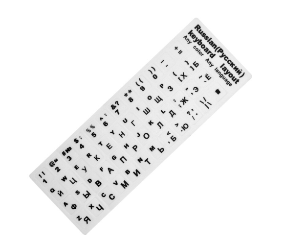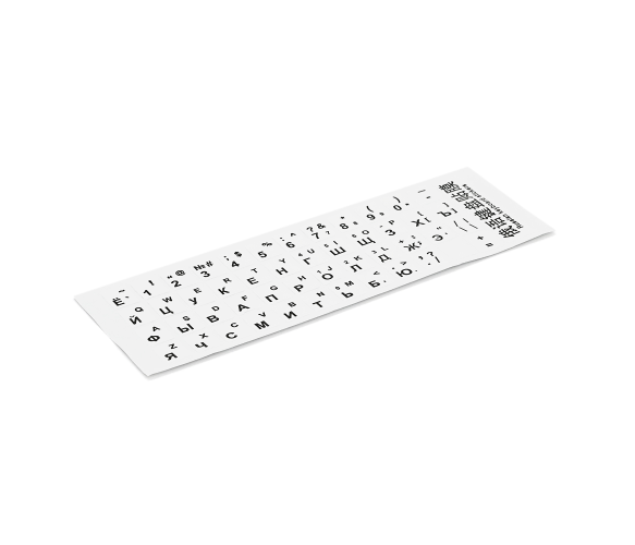 Опис: Наклейки на білу клавіатуру з чорними літерами Рус. Англ.Характеристики:1. Колір: білий2. Літери: чорні3. Мови: Російська, Англійська