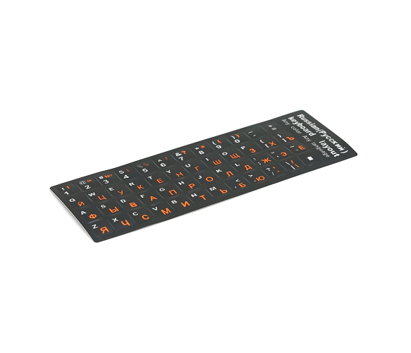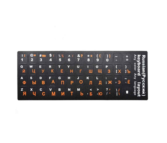 Опис: Набір наклейок на клавіатуру, чорного кольору, з білими англійськими літерами та помаранчевими російськими літерами.